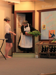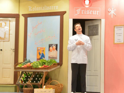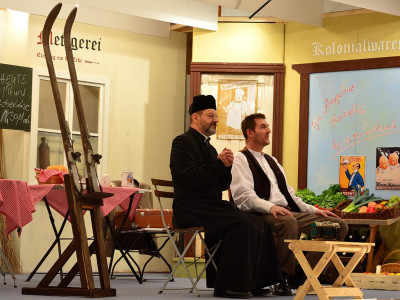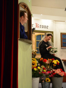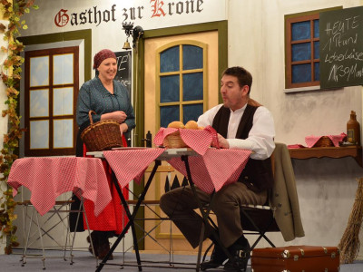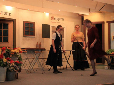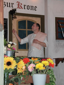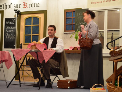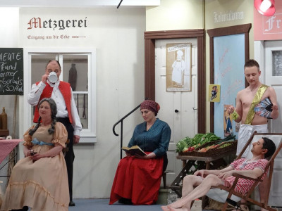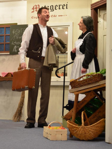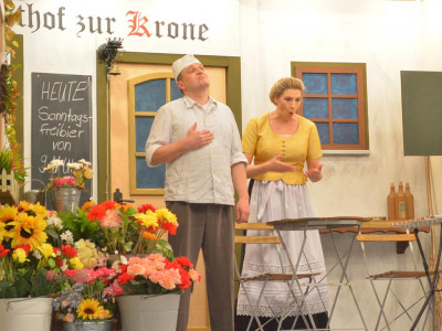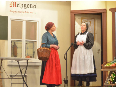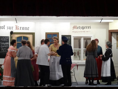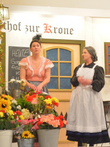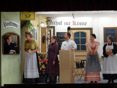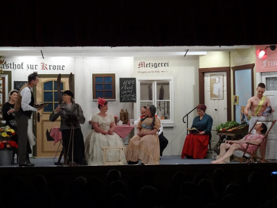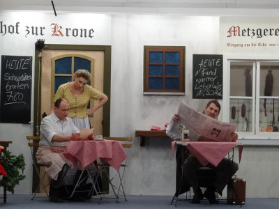 Bühnenbilder: 1 (Dorfplatz mit Kramerladen, Blumenladen, Friseursalon, Metzgerei, Poststelle und Biergarten einer Wirtschaft)